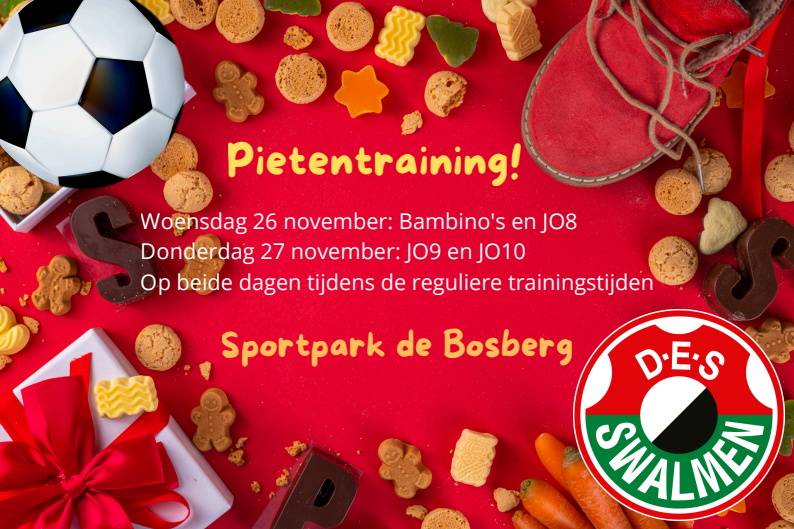 Ook dit jaar is er weer een Pietentraining voor de Bambino’s t/m JO10. Merk op dat alleen onze jeugdleden een kleinigheidje van de Pieten krijgen. Voor de ouders, broertjes, zusjes is er ranja, thee, koffie en speculaas/strooigoed.